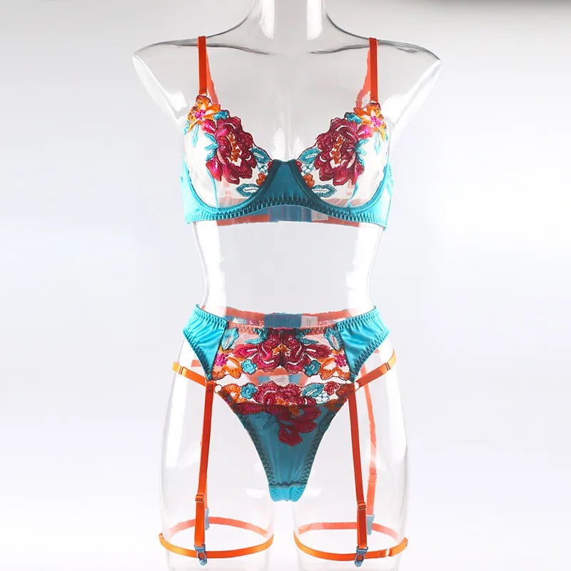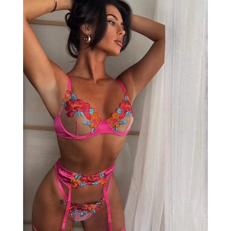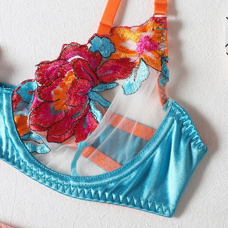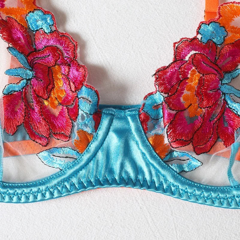 Made of soft and stretchy polyester and spandex, this lingerie set with unlined bra provides support and comfort while the intricate floral embroidery adds a touch of seduction.