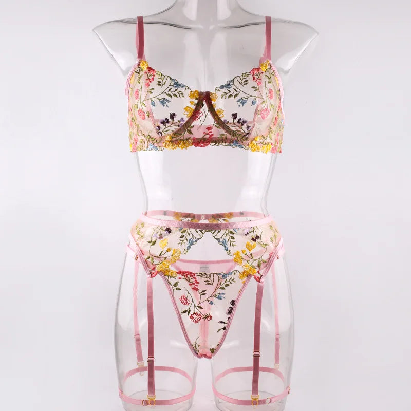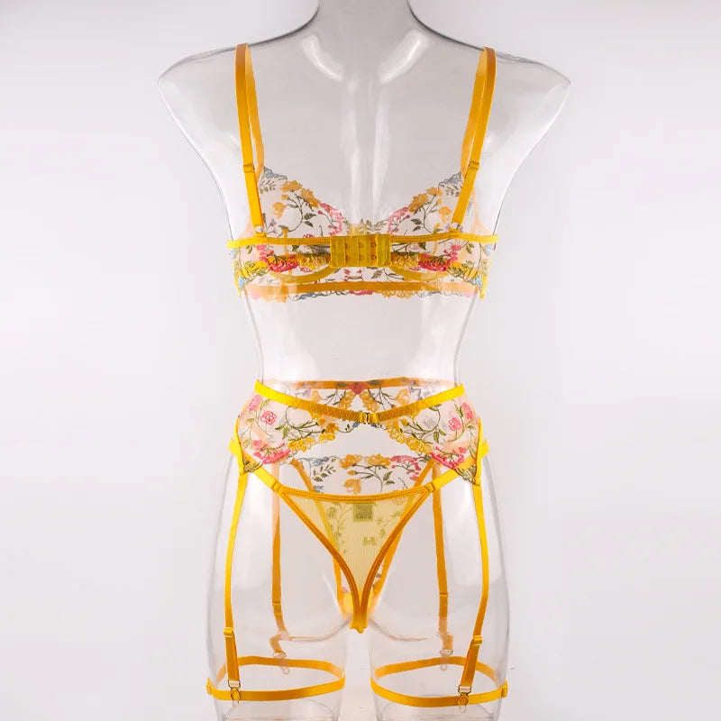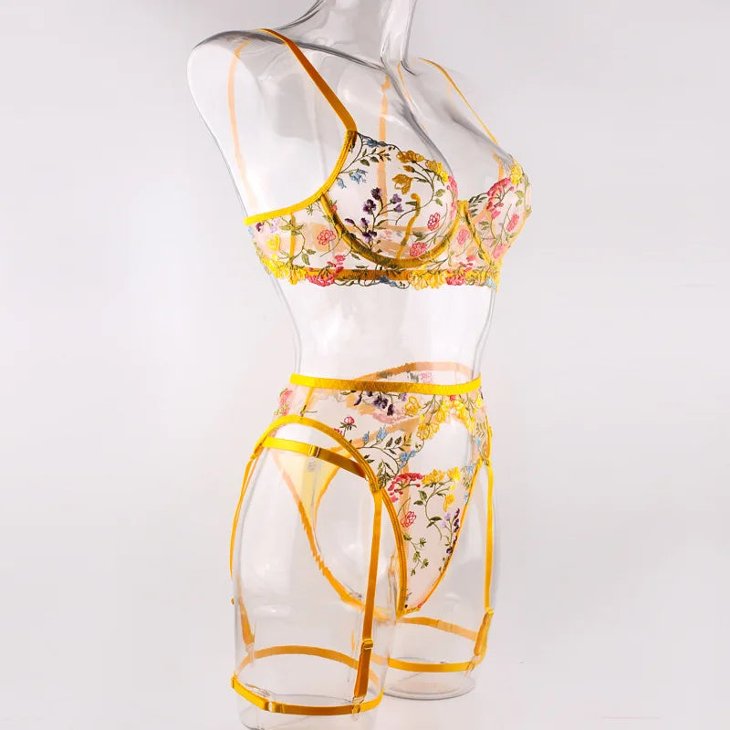 A stunning lingerie set made with soft and luxurious polyester, this set features a delicate floral pattern and intricate embroidery.