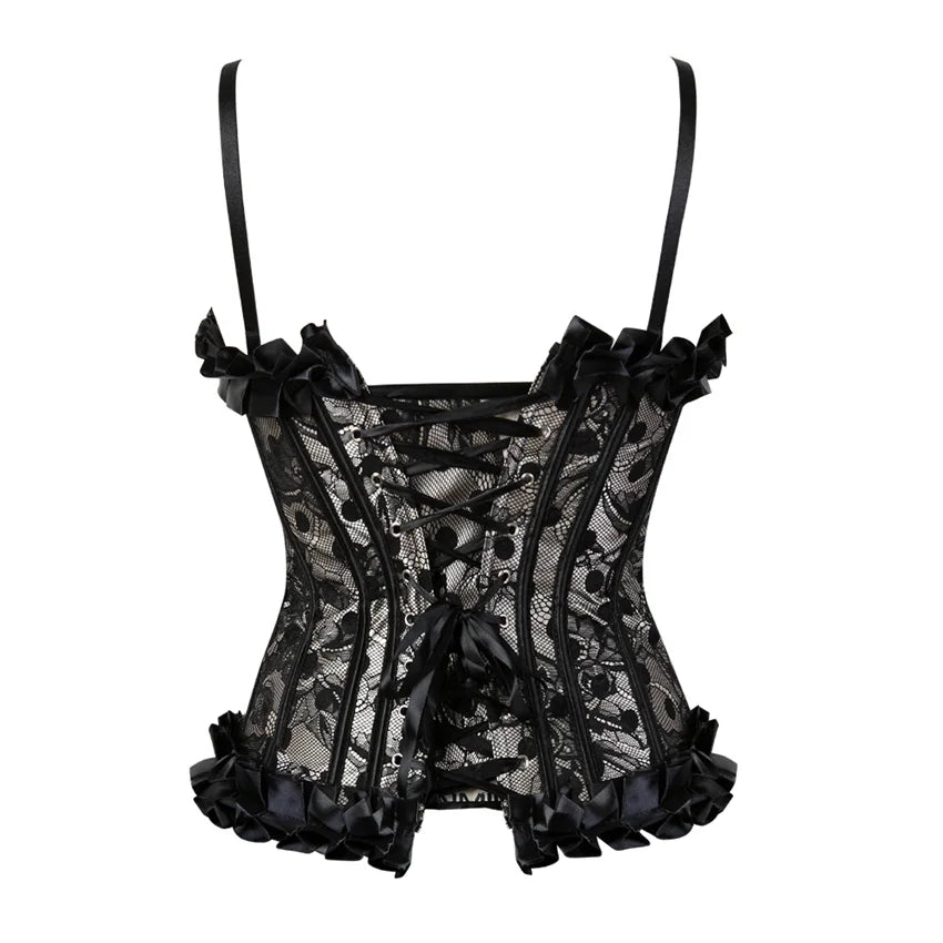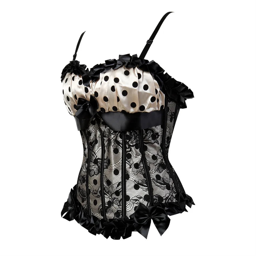 Featuring a playful dotted pattern, this bustier/corset combo is made from a comfy blend of spandex and polyester, with cute ruffles and a bow for extra flair.