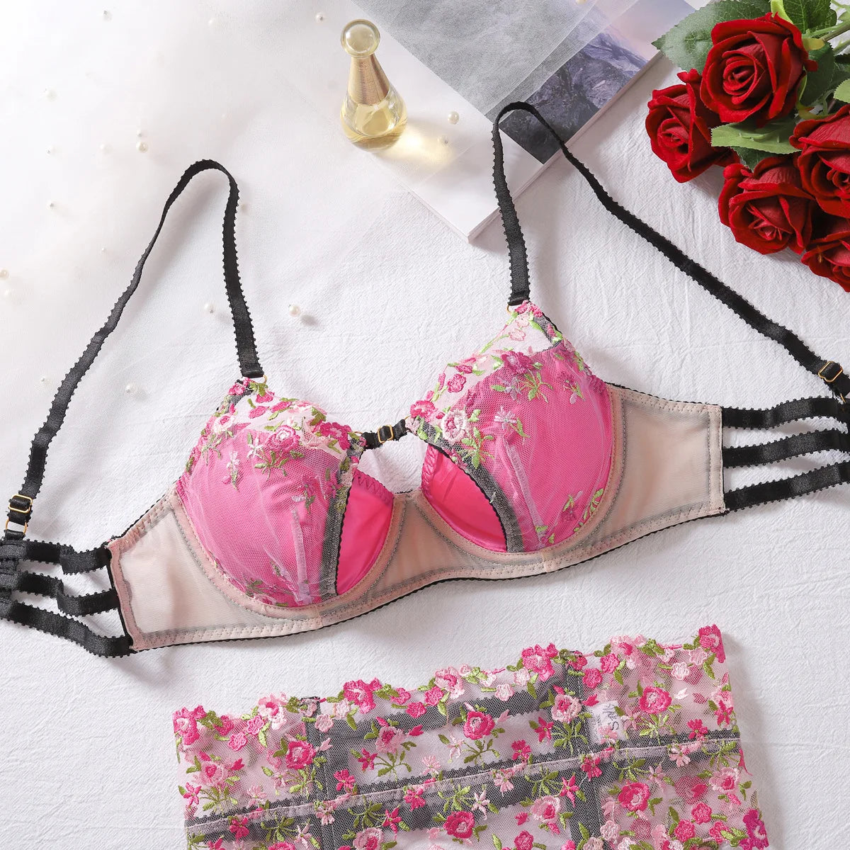 Made of luxurious linen with exquisite embroidered floral patterns, it provides support with an underwire and a push-up bra style.